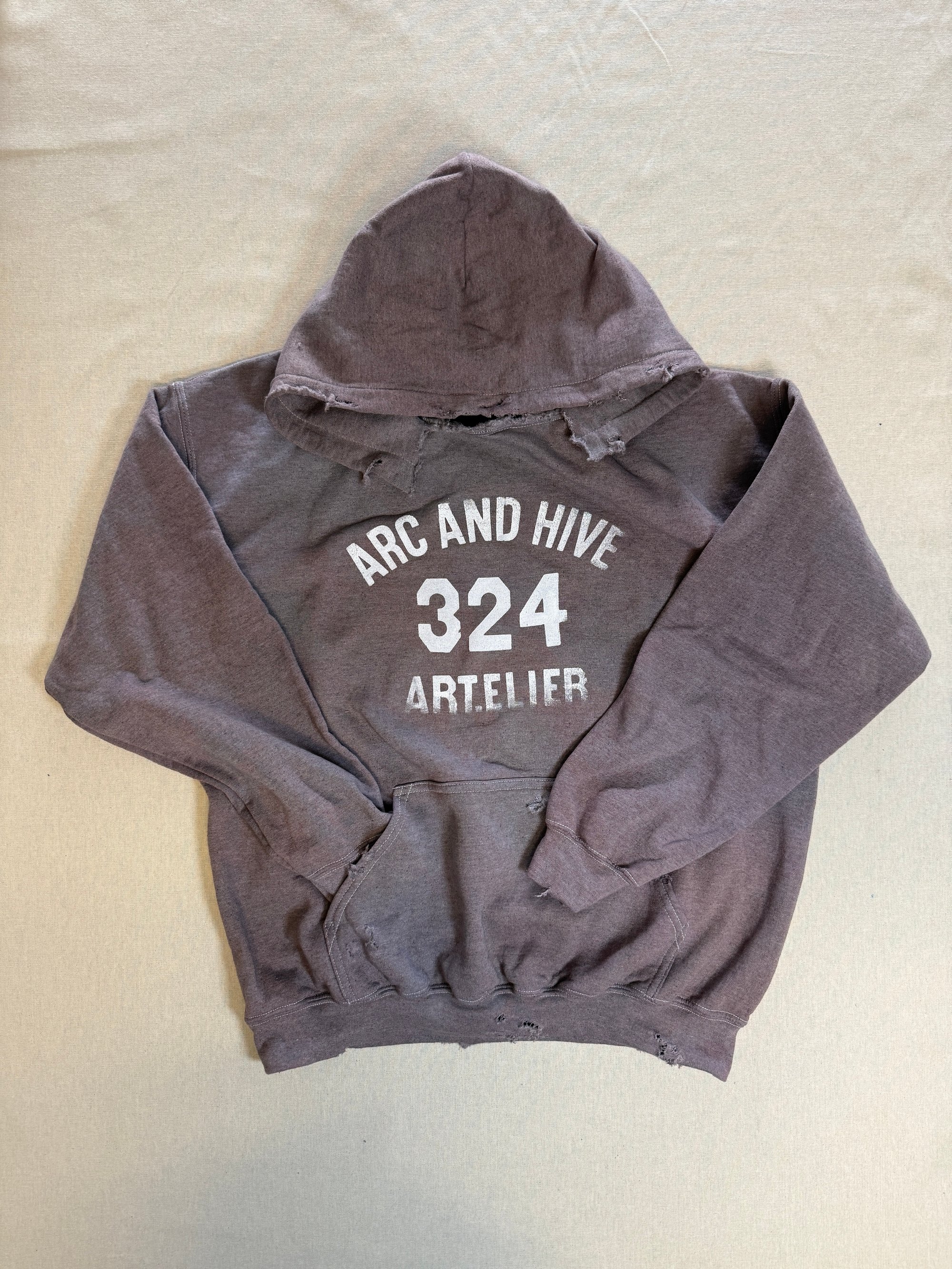 Upcycled Hoodie, Hand-dyed washed purple-gray, 324 distressed graphic, hand distressed, Fits Unisex M/L