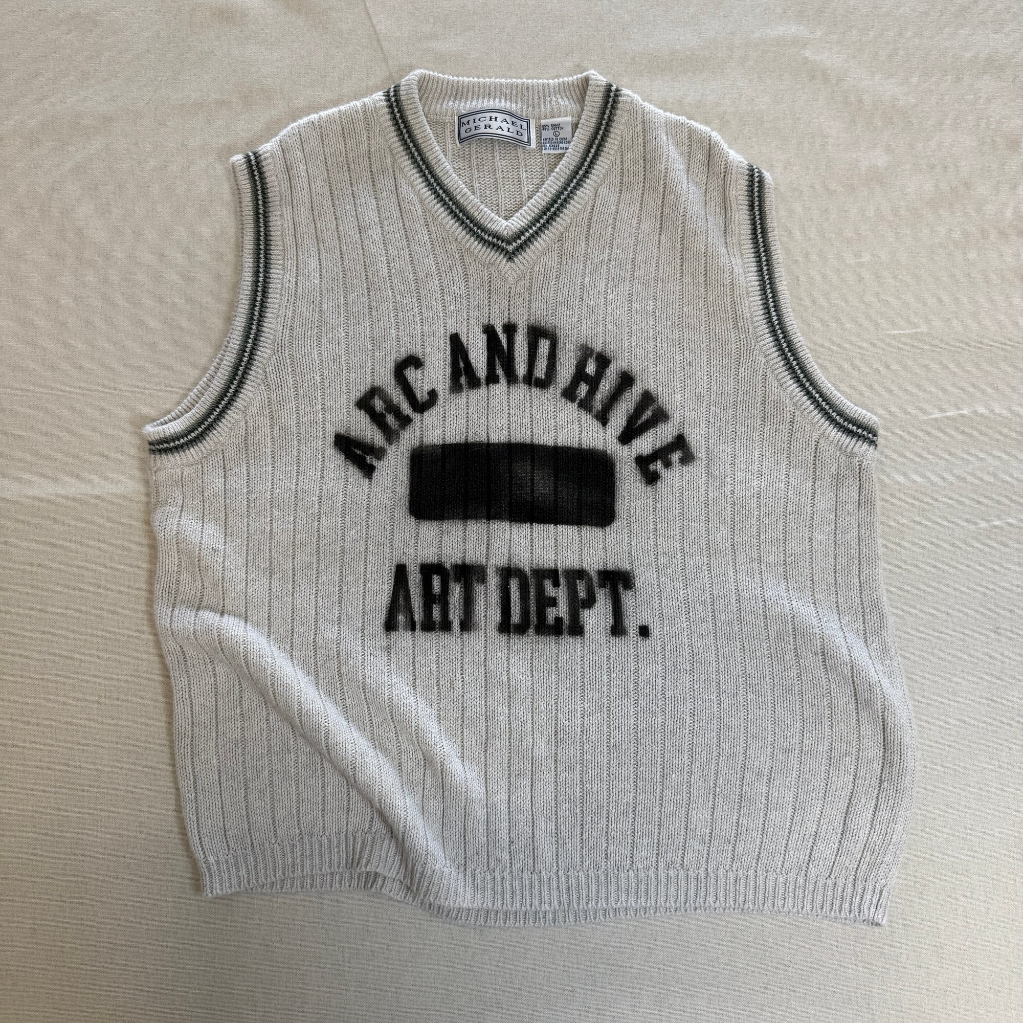 Authentic Vintage sweater vest with A&H "Art Dept." sprayed graphic, Crop fitted, Knitted, Cotton, Fits sizes Small/Medium