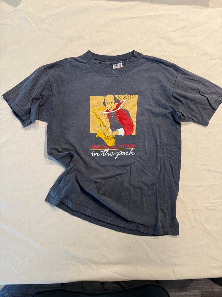 Vintage Singe-Stitch Oneita Tee, Jazz merch tee, distressed Benjamin Franklin Sax graphic