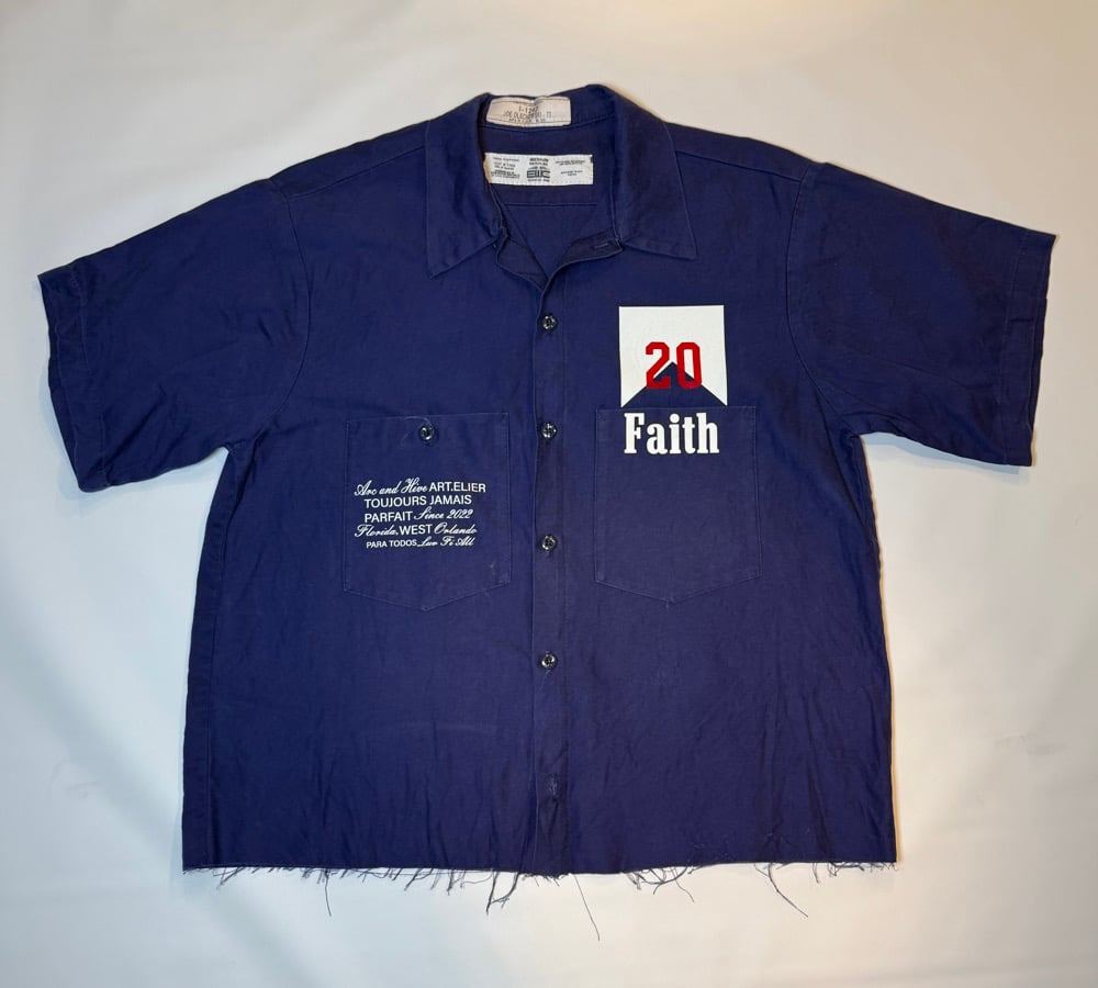 Vintage workwear shirt reworked w/A+H graphics, NavyRed/White, size M