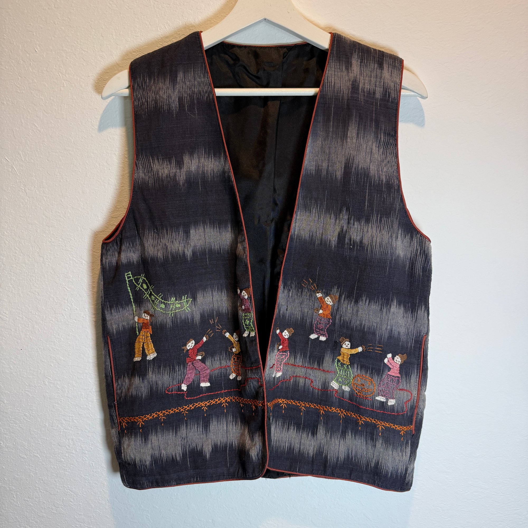 Vintage hand-embroidered vest, pockets, cotton, piping lined. Fits Size small/medium